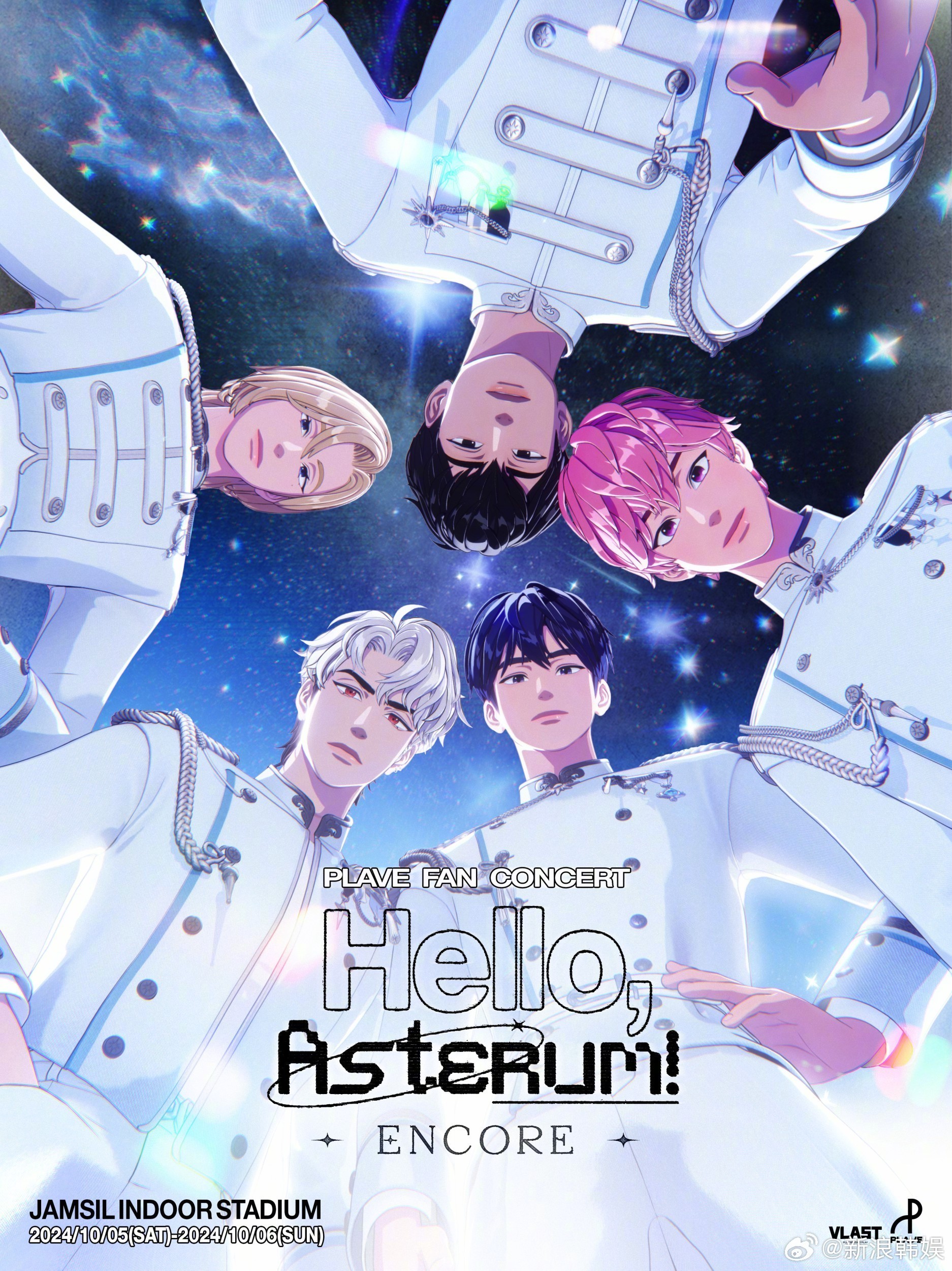 #plave首尔安可演唱会# Plave将于10月5日至6日在首尔蚕室室内体育馆举行为期两天的首场演唱会安可场《Hello, Asterum》。该演唱会门票在预售开始的同时就全部售罄。Plave于今年2月发行了迷你2辑《Asterum:134-1》。
